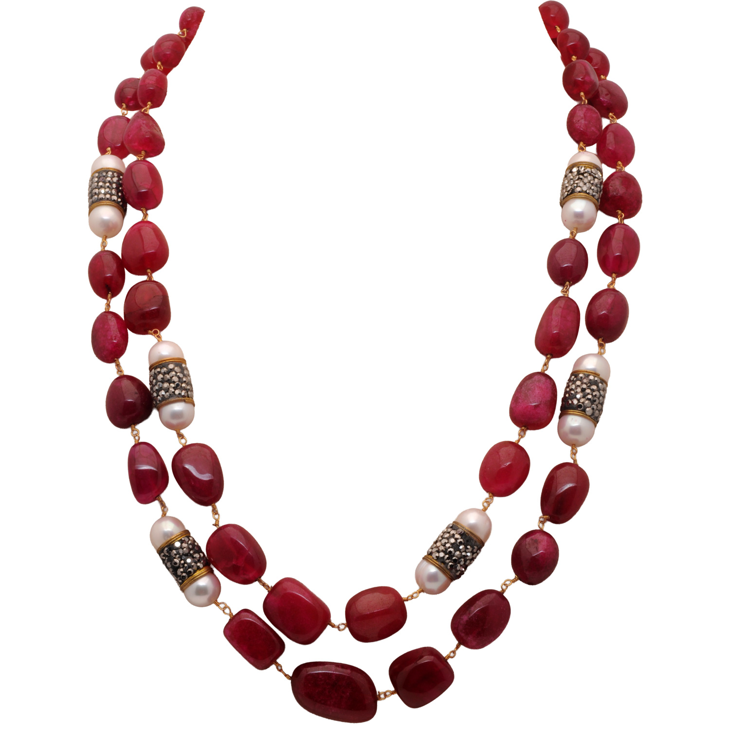 2 Rows Ruby Tumble Shape Bead & Pearl Necklace & Earring Set