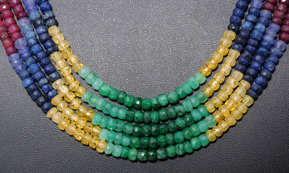 Gehna Jaipur’s 5 Lines 512.5 Carats Ruby Emerald Sapphire Precious Gemstone Bead Necklace offers a sophisticated and opulent design. Perfect for girls and women, this necklace features five rows of exquisite ruby, emerald, and sapphire beads.