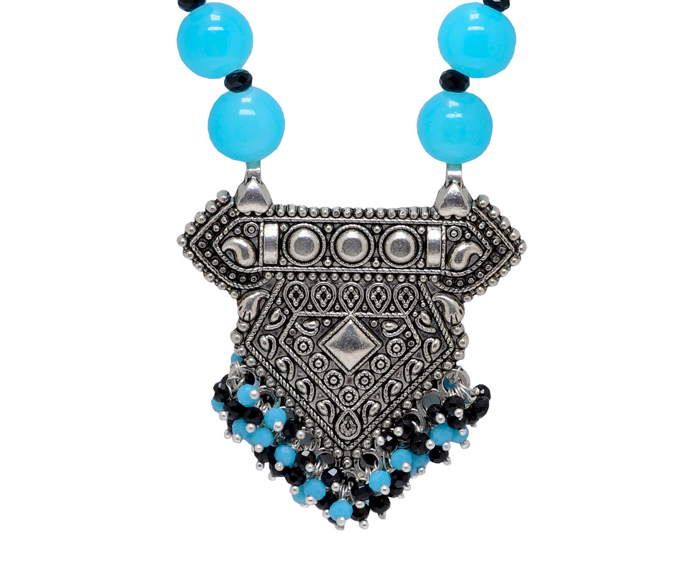black spinel & blue chalcedony bead necklace with pendant WITH WHITE GOLD RHODIUM POLISH