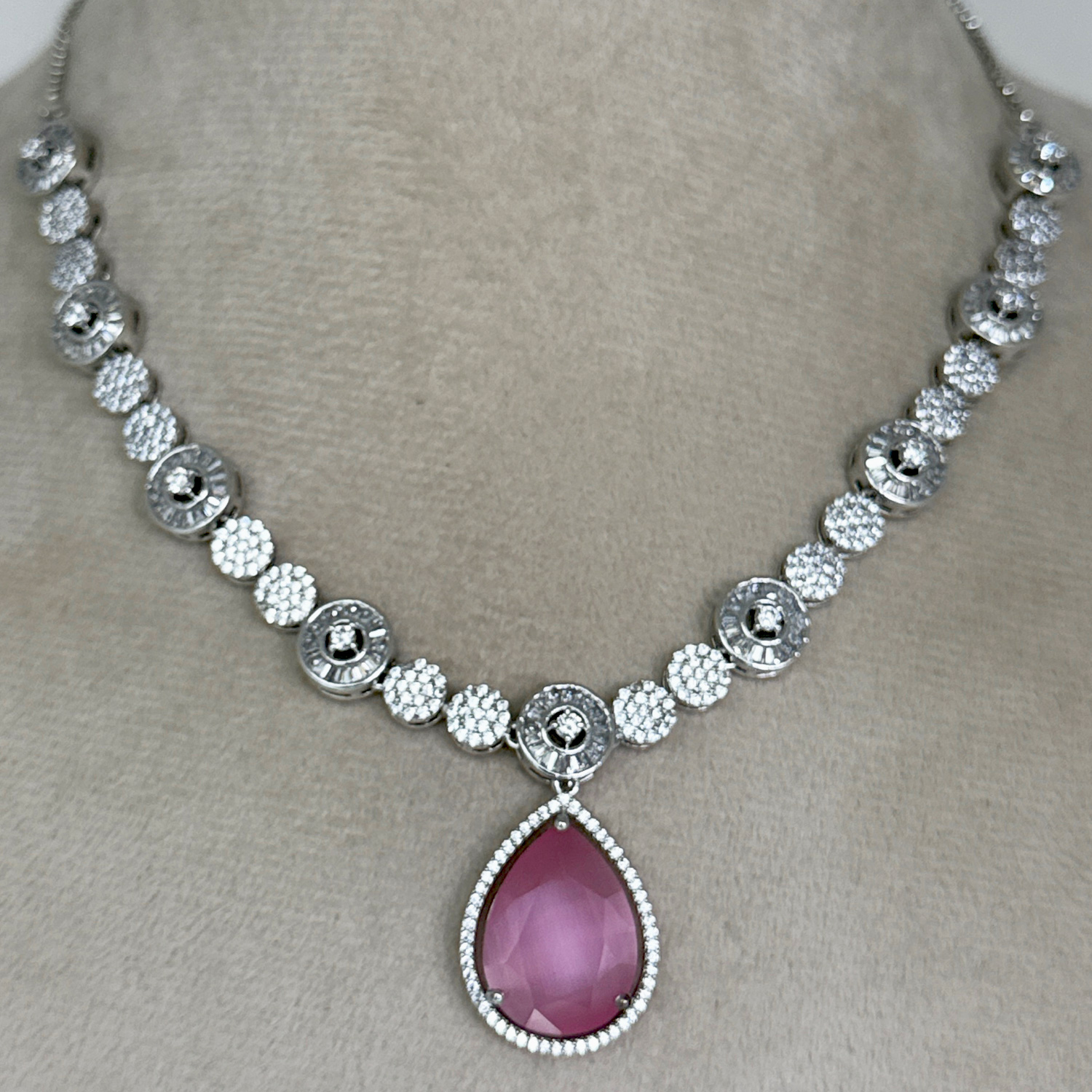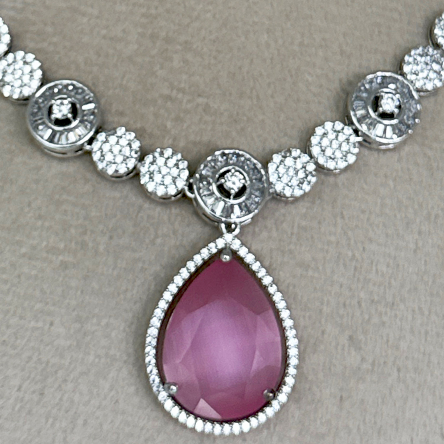 C.Z & Rose Quartz Pear Shape Stone Studded Necklace & Earring Set