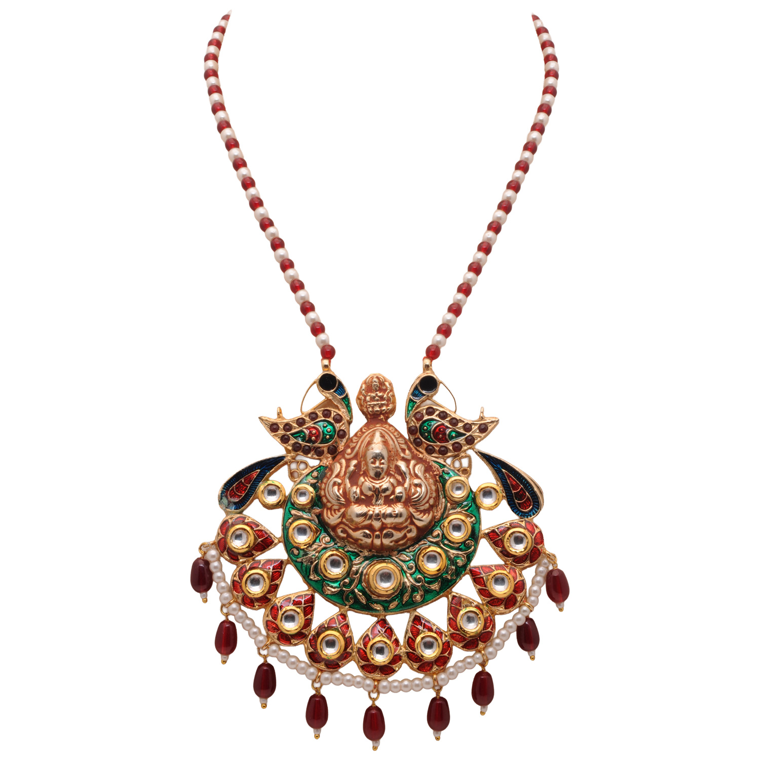 Divine Goddess Lakshmi Pendant & Earring With Pearl & Ruby Color Beads