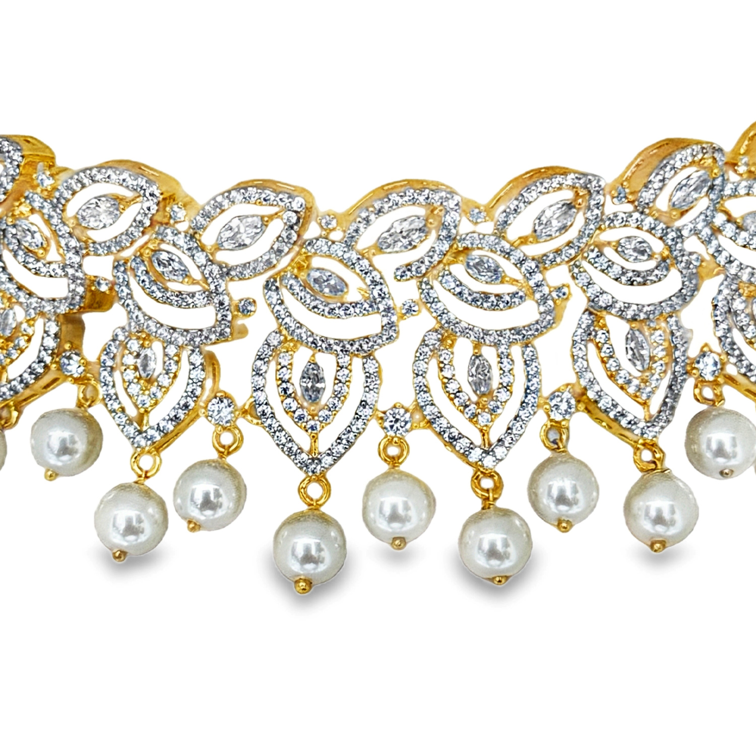 Cubic Zirconia & Pearl Studded Wedding Wear Choker Style Necklace Set