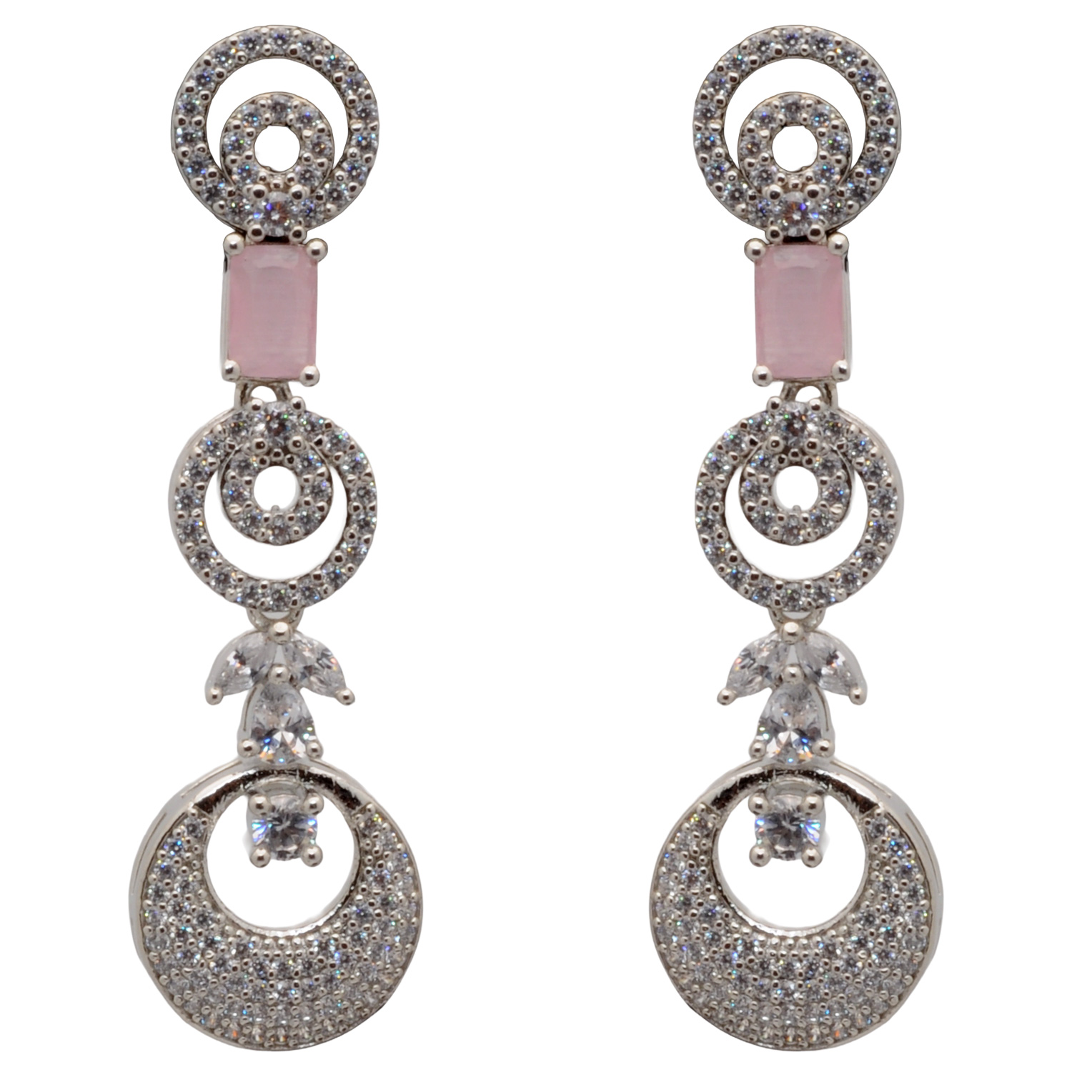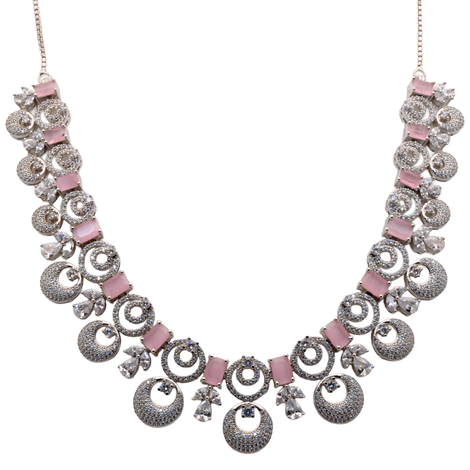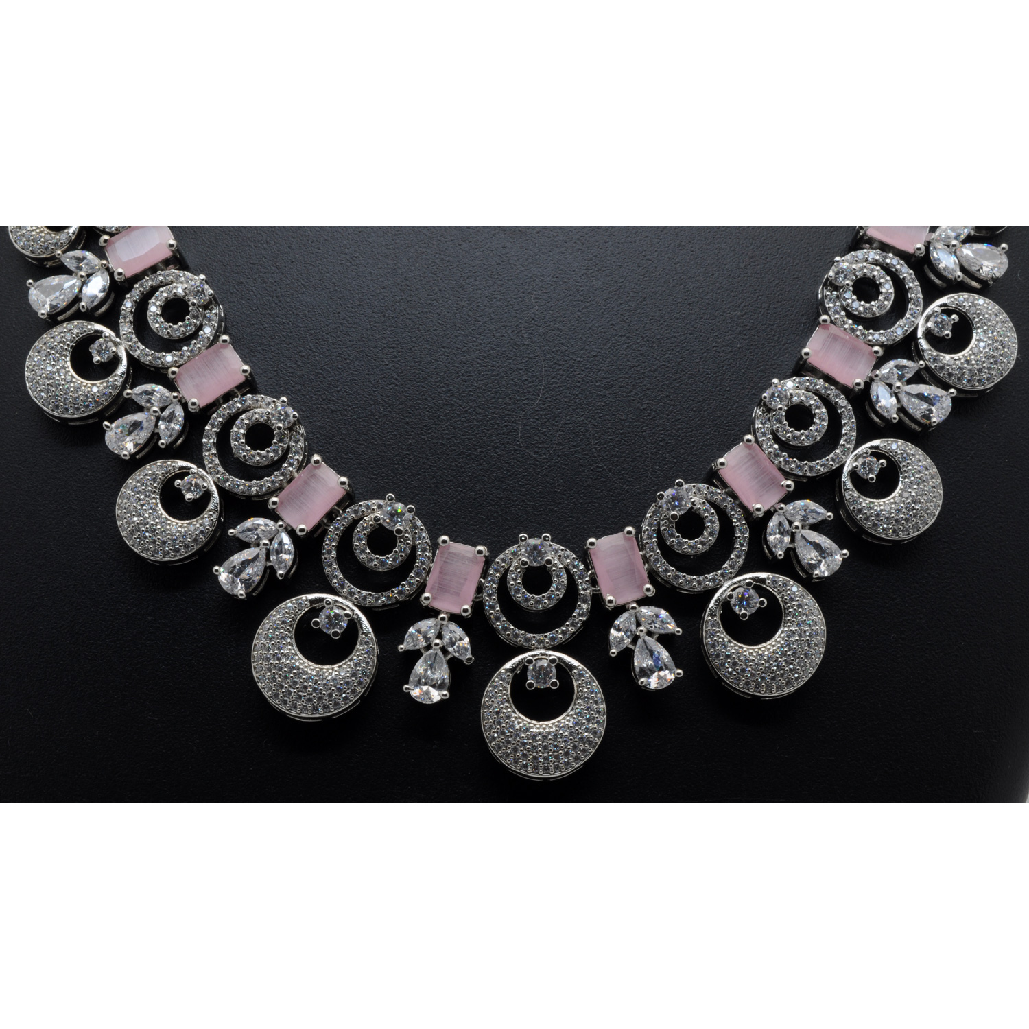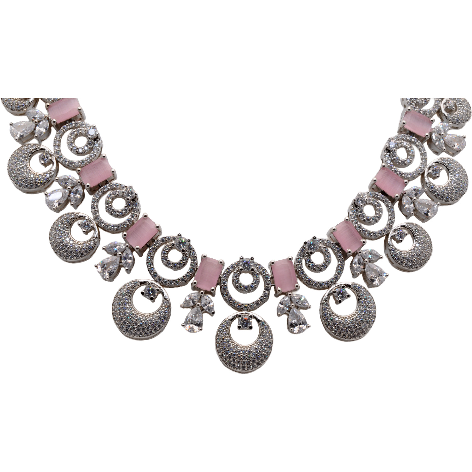 Cubic Zirconia & Rose Qwartz Color Stone Studded Necklace & Earring Set