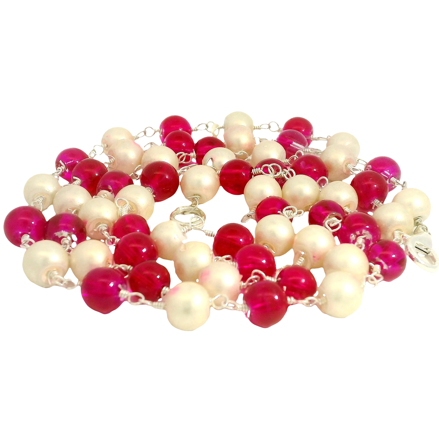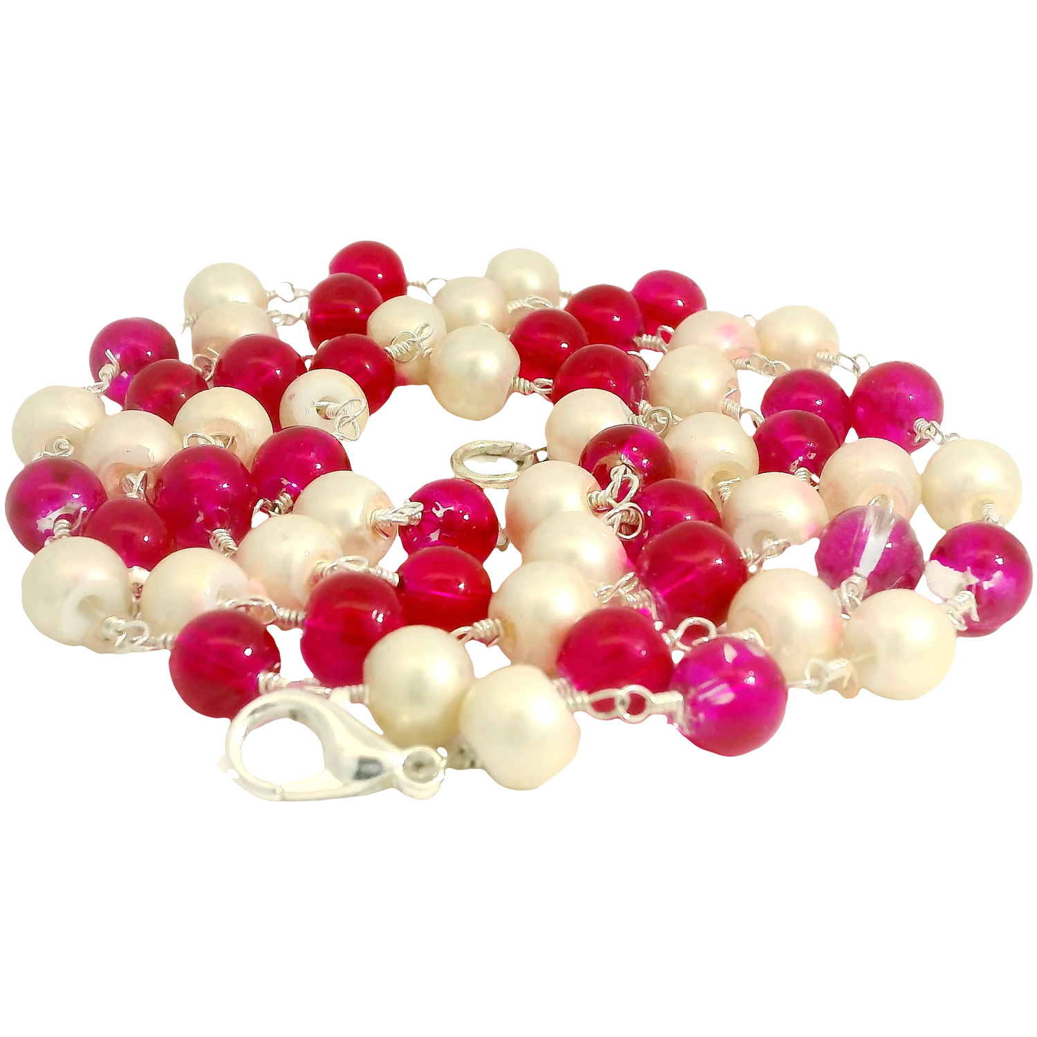 Gehna Jaipur Pearl & Pink Quartz Color Zirconia Beads Rosary Chain Silver Rhodium Plating For Girls & Women CC-1261