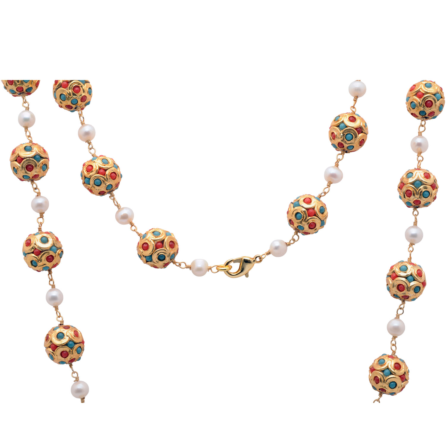 Gehna Jaipur Pearl & Red Jasper, Turquoise Stone Studded Jadau Balls Necklace Earring & Bracelet For Girls & Women LN01-1133