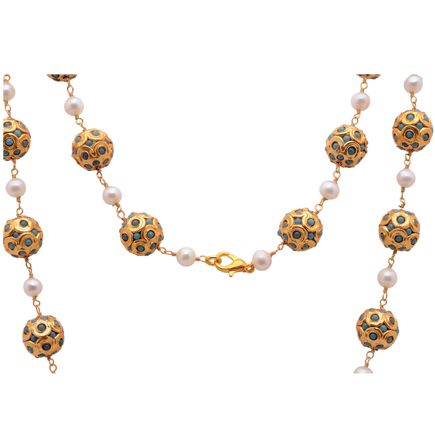 Gehna Jaipur Pearl & Turquoise Stone Studded Jadau Balls Necklace Earring & Bracelet For Girls & Women LN01-1130
