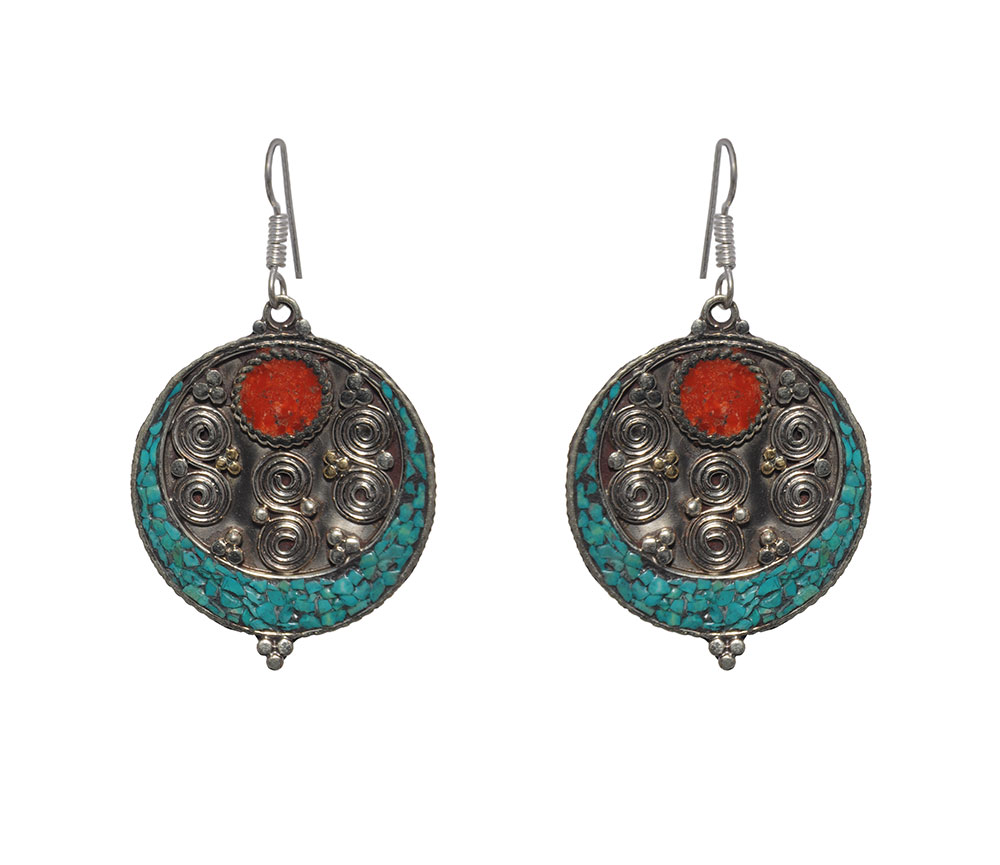 Gehna Jaipur’s round Tibetan earrings feature turquoise & coral gemstones, blending elegance and tradition. Perfect for girls & women, these vibrant handcrafted pieces add a colorful statement to any outfit.