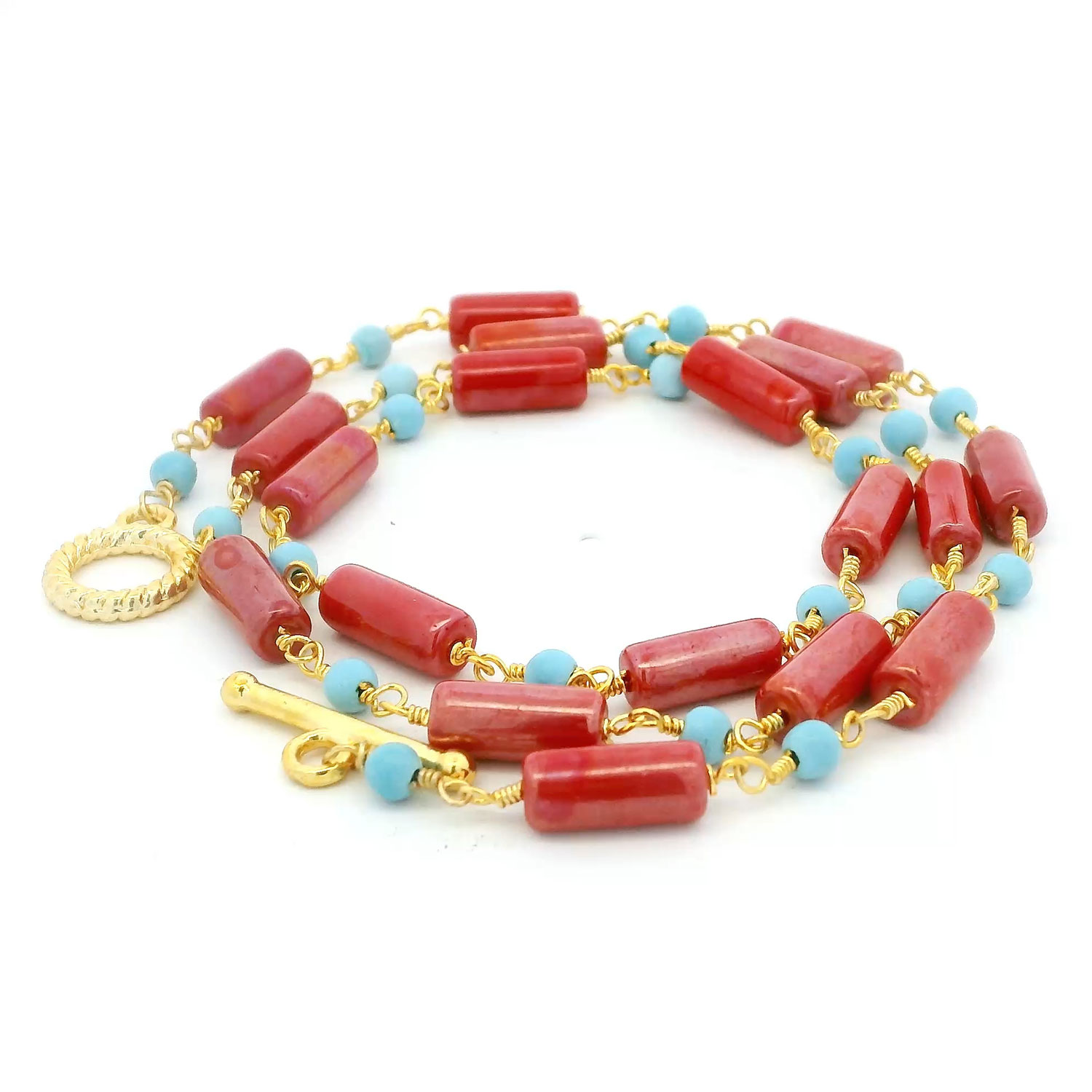 Gehna Jaipur Turquoise & Red Jasper Gemstone Tube Shape Bead Chain Knotted In Gold Plated For Girls & Women CP-1090