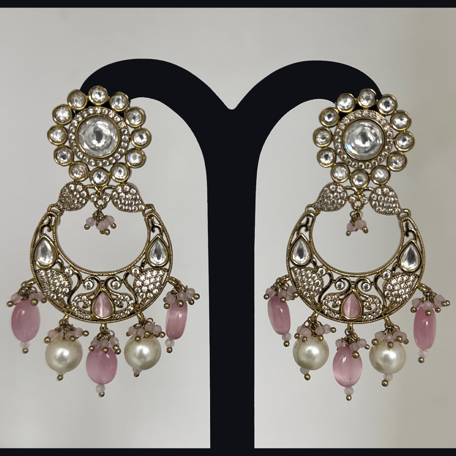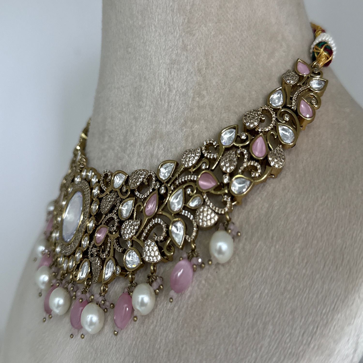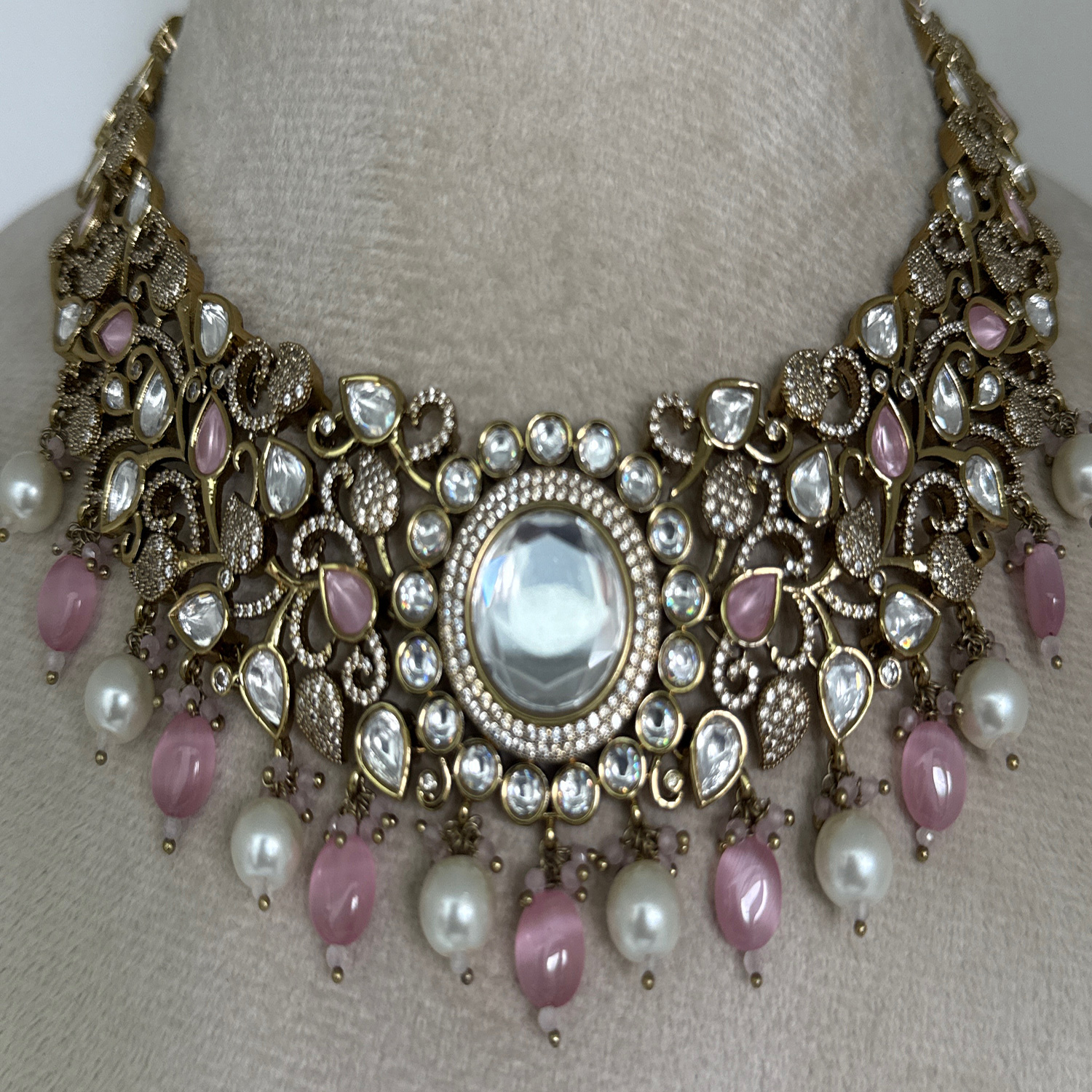 Mossanite Polki & Rose Quartz Studded Necklace & Earring Set