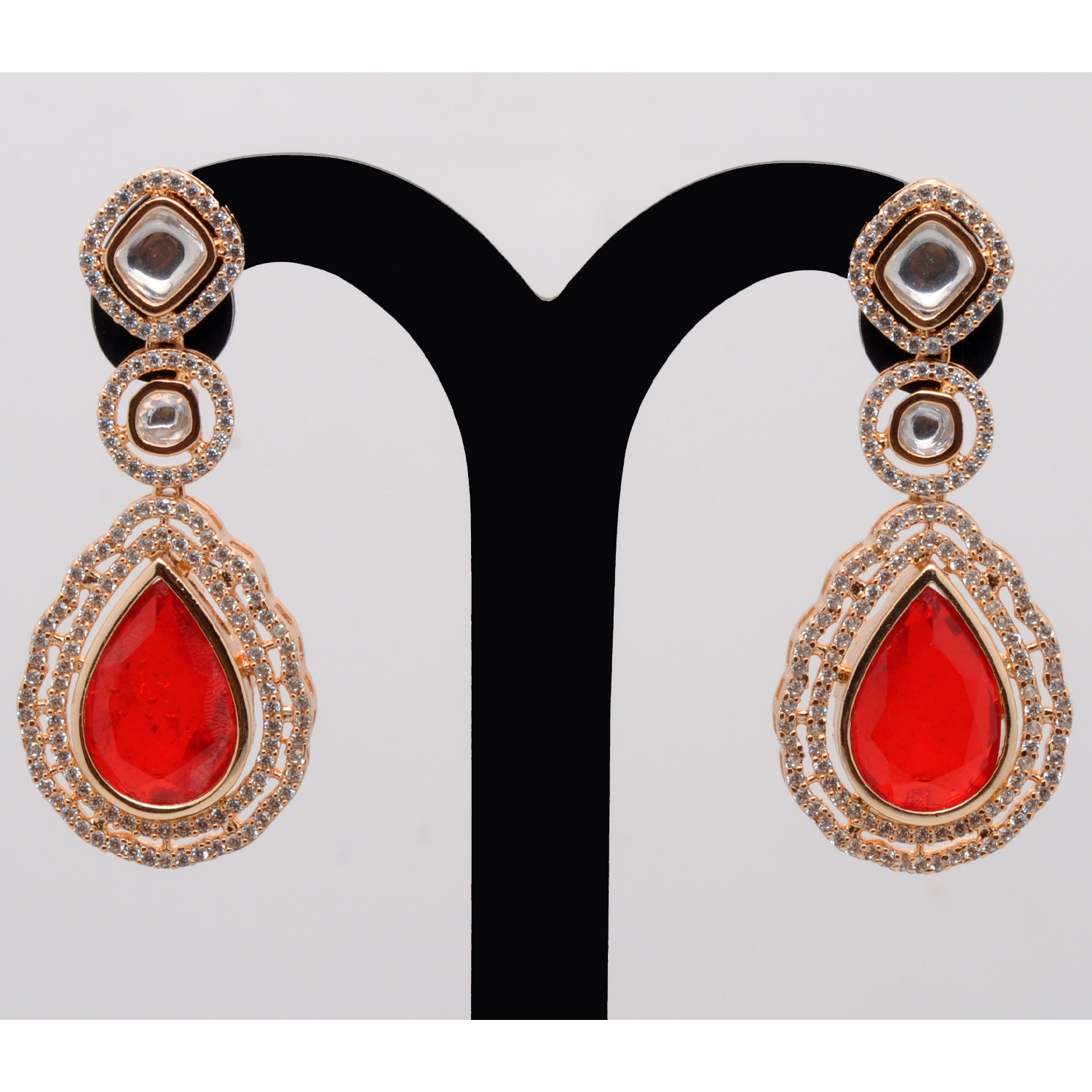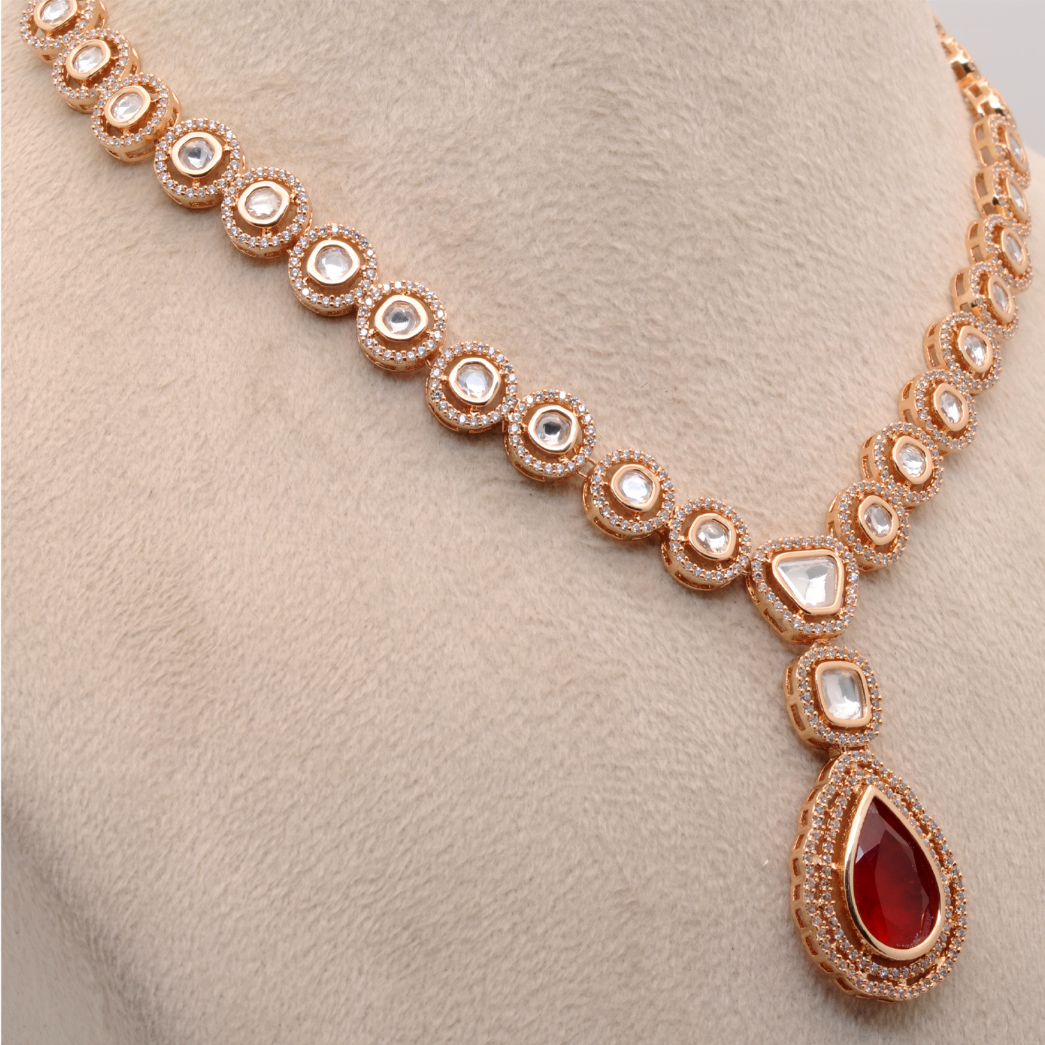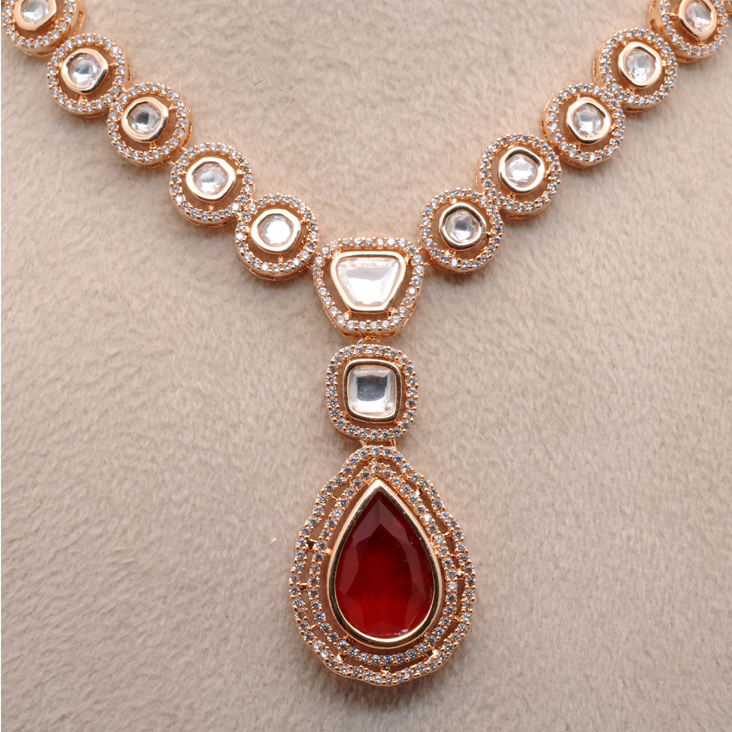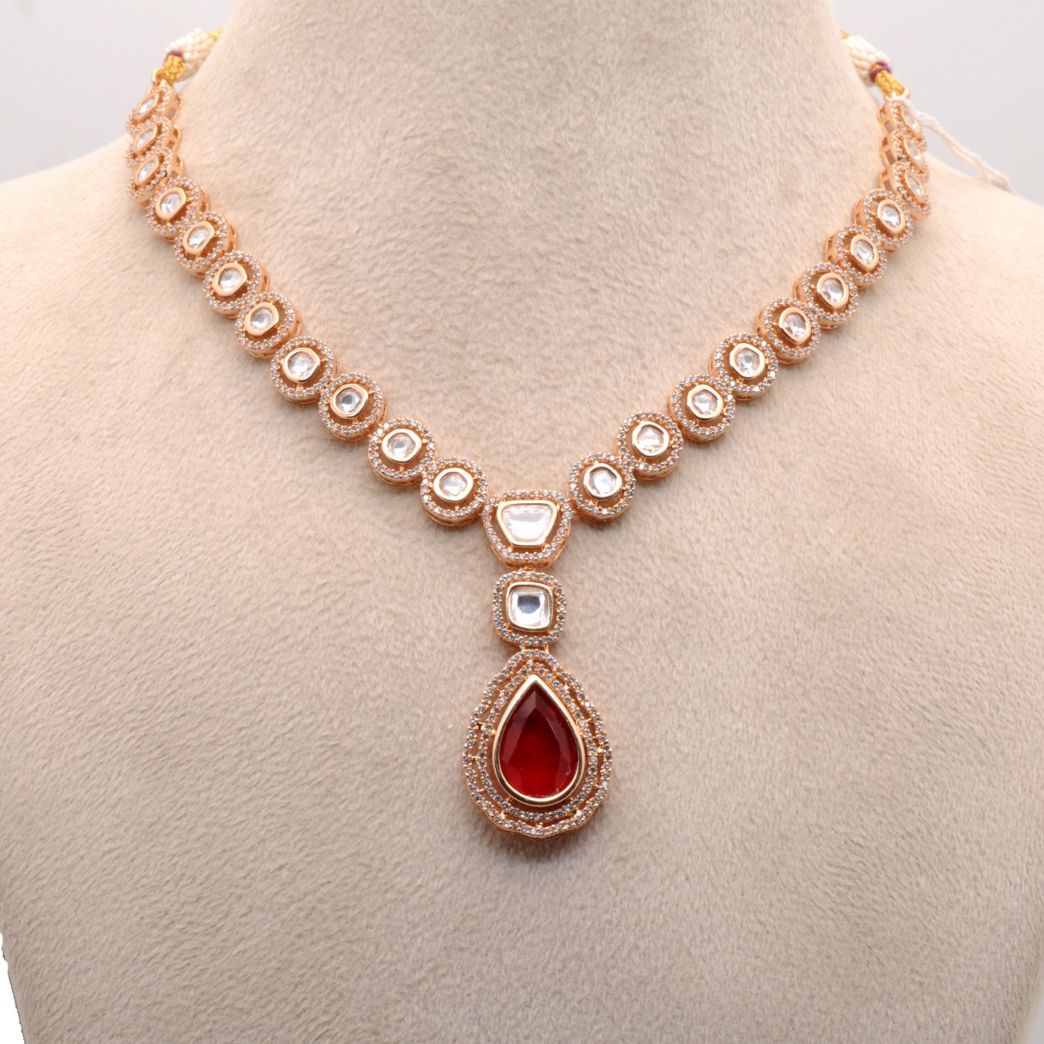 Mossanite Polki & Ruby Color Stone Studded Necklace & Earring Set