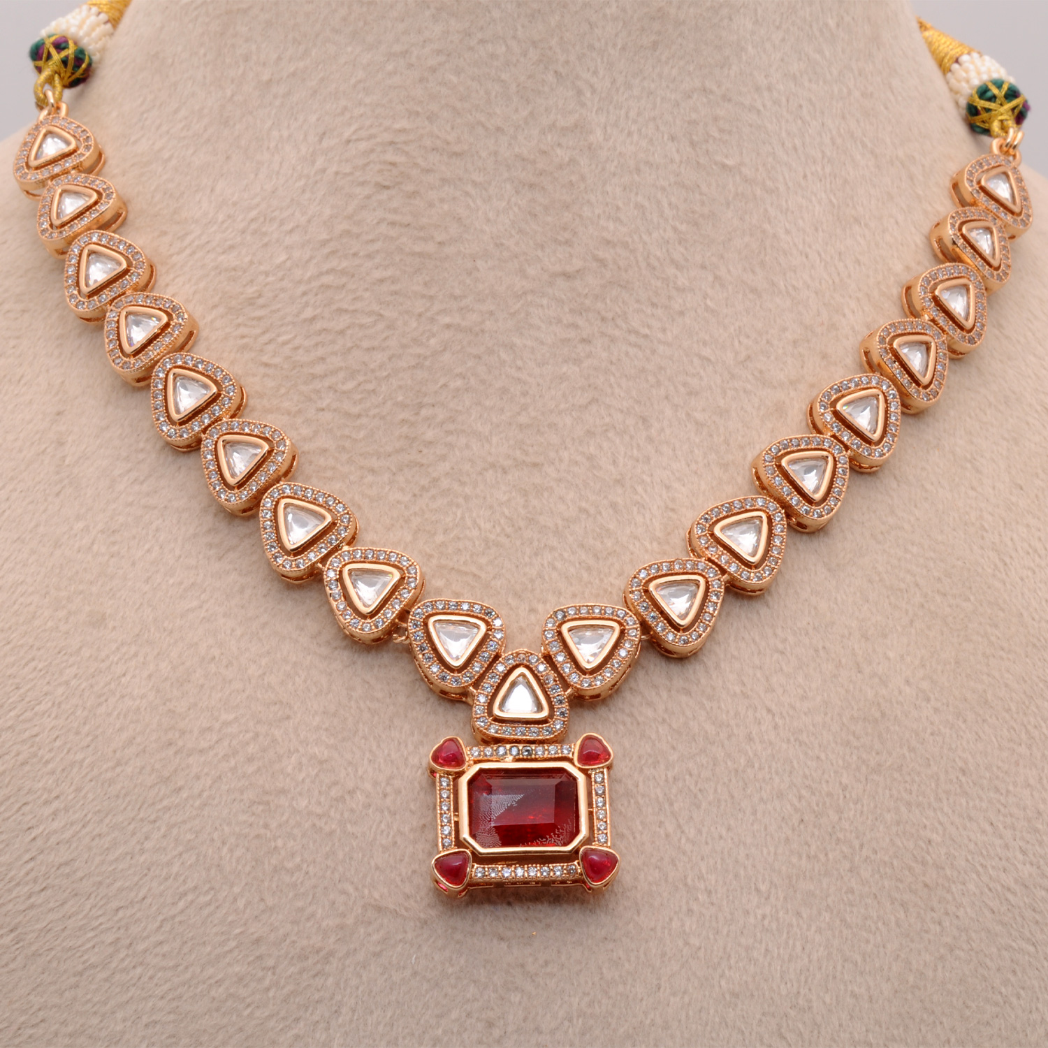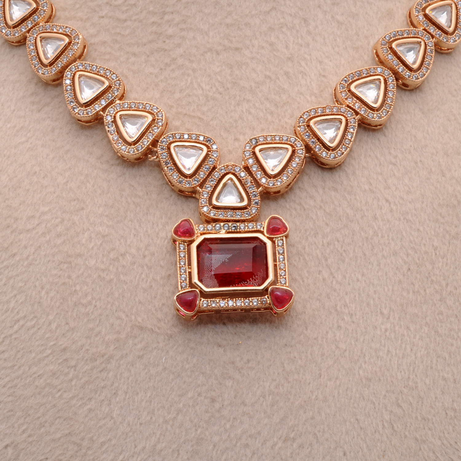 Mossanite Polki & Ruby Color Stone Studded Necklace & Earring Set