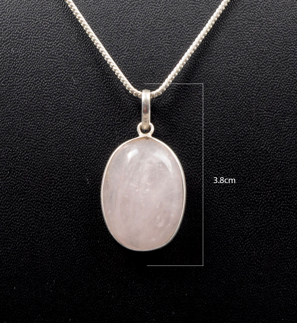 Gehna Jaipur rose quartz oval pendant highlights soft pink charm set in silver plated metal. A classic design that enhances every outfit.