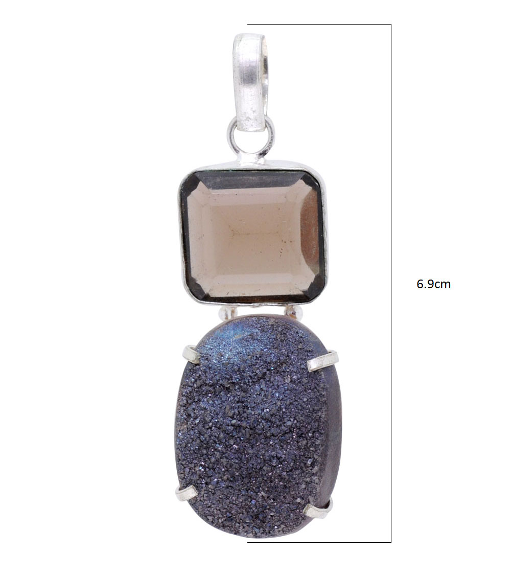 Smokey Quartz & Druzy Gemstone Studded pendant In .925 Silver Overlay