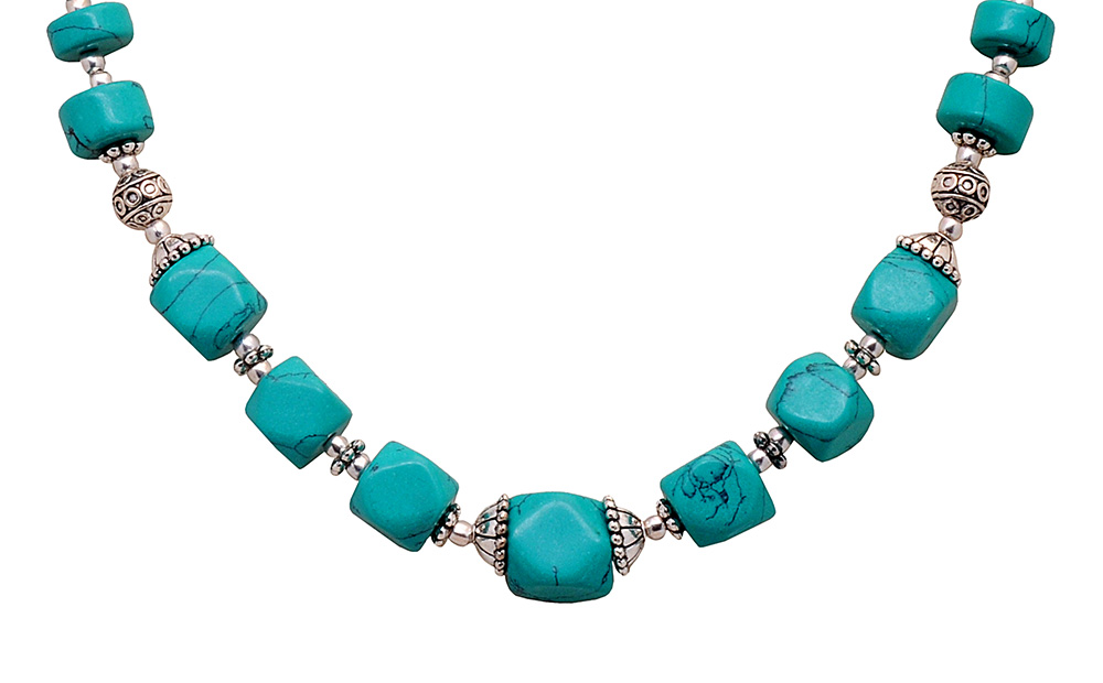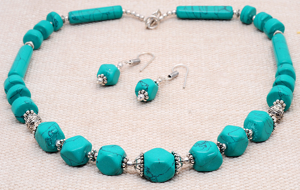 Turquoise gemstone studded necklace & earring set WITH OXIDIZED RHODIUM POLISH